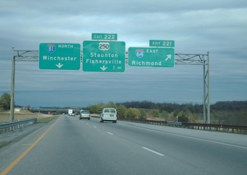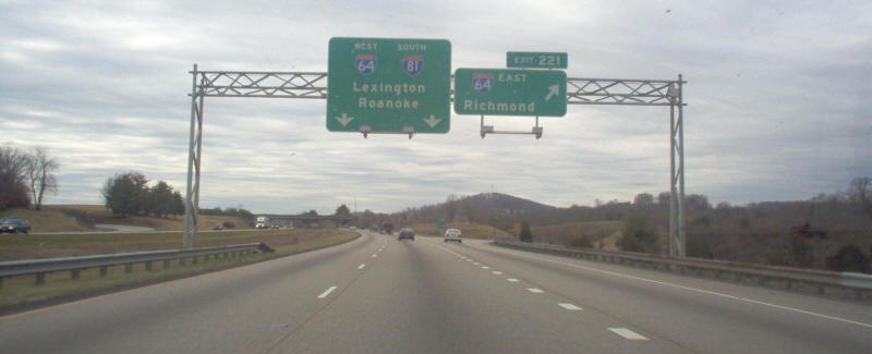 | The beginning of the I-64/81 duplex from I-81 northbound. Photo by Mapmikey, taken January 26, 2006. | |
