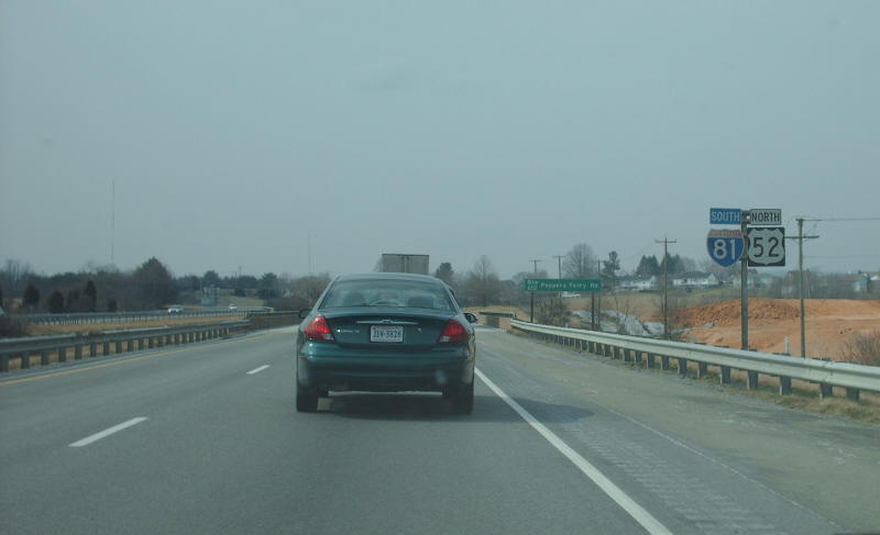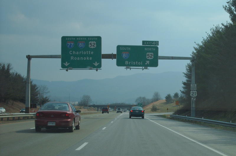 | From I-81 northbound at Exit 70 where US 21 ends and US 52 joins I-81. Photo by Adam Froehlig, taken May 24, 2003. | |