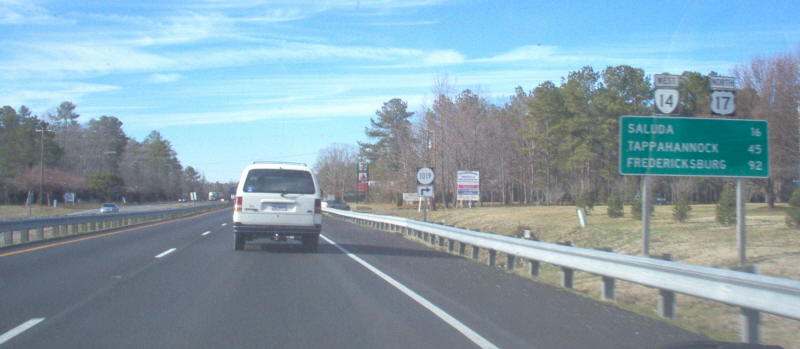 | Northbound US 17 at US 17 Business north of Gloucester, where VA 14 joins in, although the 14 west shield is missing. Photo by Mapmikey, taken February 19, 2006. | |