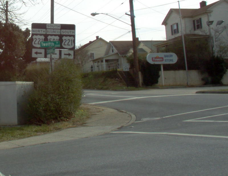 | From US 501 Bus south approaching US 221-US 460 Bus. The telephone pole is most inconveniently placed. Photo by Mapmikey, taken July 22, 2006. | |