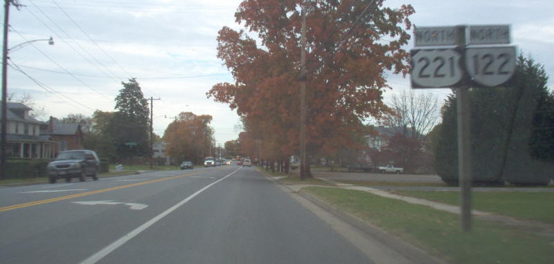 | The north end of the duplex shown from Bus US 221 and Bus VA 122. Unposted is US 221 south to the right. Photo by Mapmikey, taken October 26, 2006. |