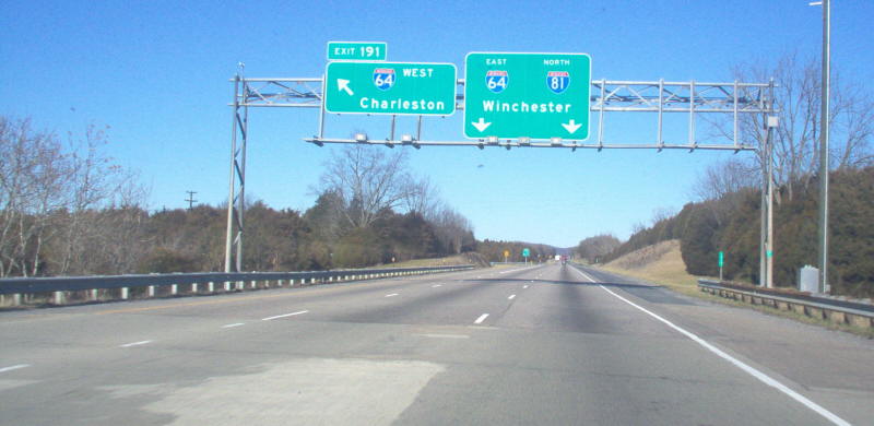 | The split of the routes from I-81 southbound. Photo by Mapmikey, taken January 26, 2007. | |