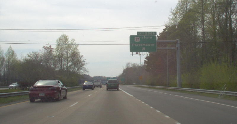 | The end of the I-64/US 17 duplex shown from I-64 Suffolk-bound. This is also the end of US 17 Business for Deep Creek. Photo by Mapmikey, taken April 7, 2006. | |