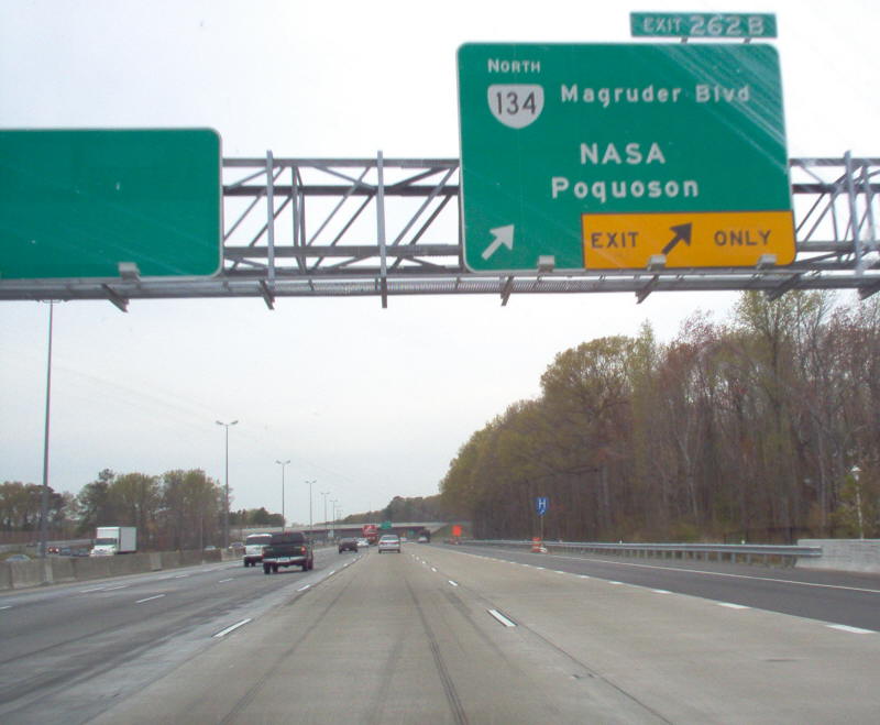 | The I-64 westbound look at Exit 262B, where VA 134 leaves I-64 after a brief duplex. This is shown right before a widening project was completed in the Hampton area. This is about the spot where a tree in the median used to be mysteriously decorated for various holidays in the early 1990s. Photo by Mapmikey and Adam Froehlig, taken April 7, 2006. |