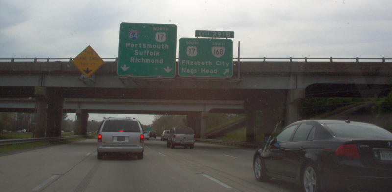 | Along I-64 Suffolk-bound, where US 17 hops on and VA 168 hops off. US 17 and VA 168 share a brief duplex after this ramp. Photo by Mapmikey, taken April 7, 2006. |
