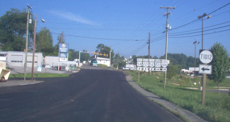 | From US 58 east at US 21-221. US 221's routings are not posted well from this angle. For an older Michael Summa view with cutouts, click here Photo by Mapmikey, taken April 13, 2007. | |