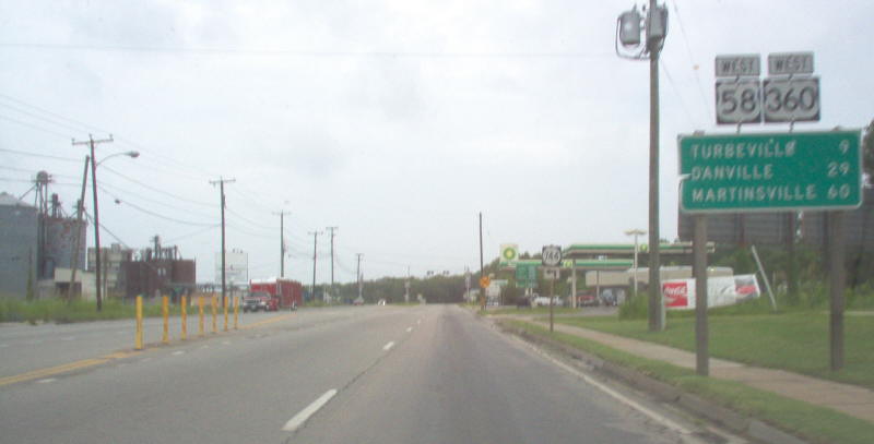 | From 1984-2005, the US 58-360 duplex began to the right. Today this is US 58 BUSINESS crossing. Photo by Adam Froehlig, taken January 27, 2002. | |