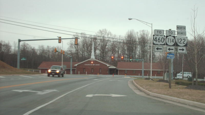 | This is US 221-122 south arriving at US 460 Business. This set of trailblazers is quite inadequate as it doesn't mention US 221/VA 122 turning left; doesn't mention 460 Business; The sign showning 122 business north to the right is extremely incorrect: NOT 122 Business and also wrong direction to boot if it was... Photo by Mapmikey, taken January 21, 2007. | |