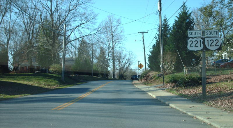 | The north end of the duplex shown from Bus US 221 and Bus VA 122. Unposted is US 221 south to the right. Photo by Mapmikey, taken October 26, 2006. |