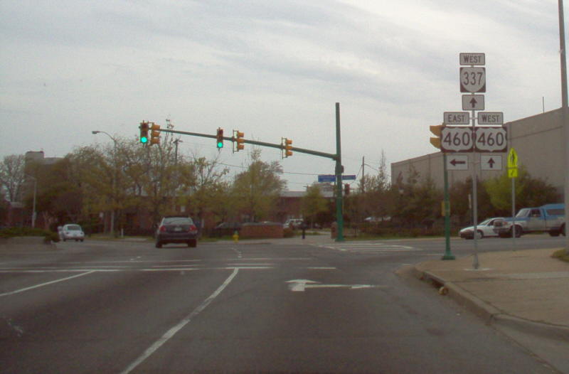 | Heading the other way, this is where VA 337 picks up US 460. Photo by Mapmikey and Adam Froehlig, taken April 7, 2006. |