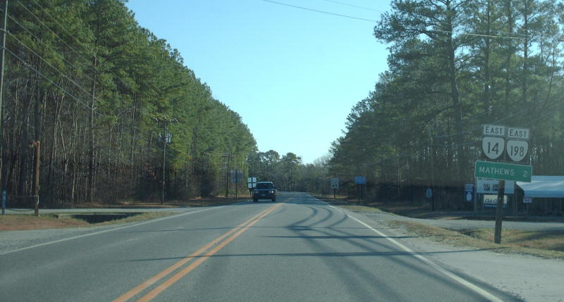 | The routes divide in Mathews proper. Photo by Mapmikey, taken February 16, 2007. | |