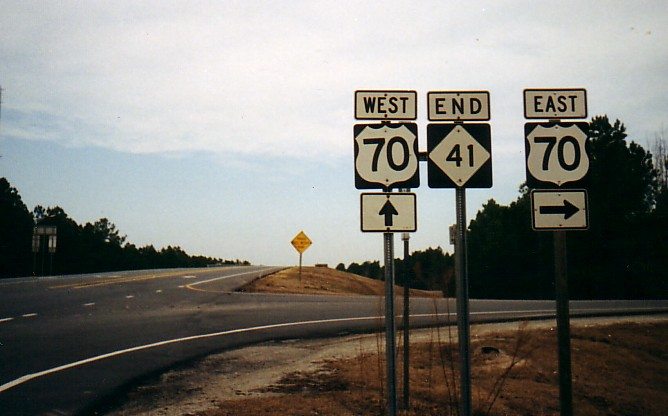 | NC 41 coming to and end at US 70 near Cove City. NC 41 east has ended here since 1980. Photo by Adam Prince. |