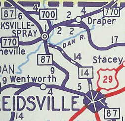 NC 14 was born in late 1940, running from US 29 (Scales St at Madison) Reidsville northwest to NC 87 (now unnumbered old 87) at the Dan River just below Leaksville-Spray. This had been part of NC 65 and is the 2nd NC 14.