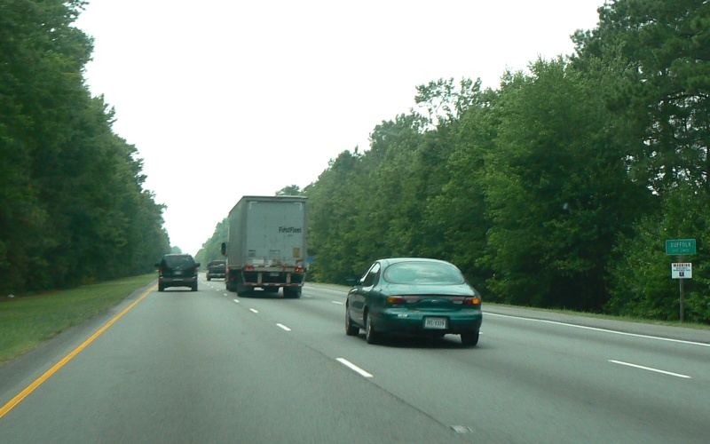 Southbound I-664 entering the City of Chesapeake from the City of Suffolk at Exit 10. Photo by Mapmikey, taken April 19, 2008. |