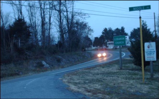 |  | Westbound VA 55 at SR 628, Lebanon Church, Shenandoah County.  Photo by Mapmikey, taken December 2010. |