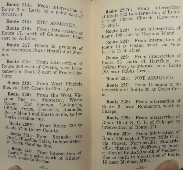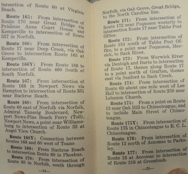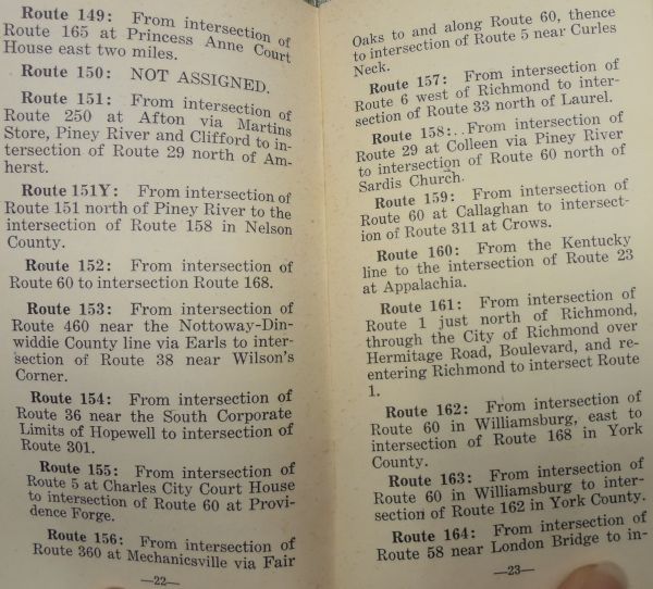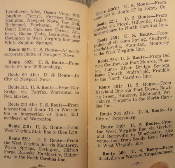 < 1941 Route Log | Home | 1951 Route Log > Road Data: September 1949, Virginia Department of Highways Distance Data: No distances given Notes: This is the official 1949 route log of Virginia, scanned in its entirety. The logbook contained a listing of all routes' descriptions, followed by a list of 32 legislatively named routes in place at that time, followed by a list of 47 legislatively named bridges in place at that time, followed by a list and description of the US routes in Virginia (including banner routes), followed by a list of the 45 waysides in place at that time, concluding with an index. Click on the thumbnails below to see the scanned pages of the logbook. |