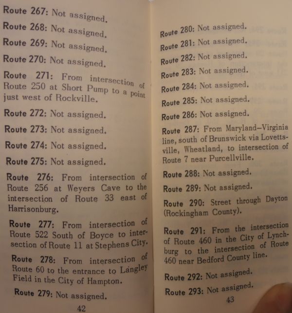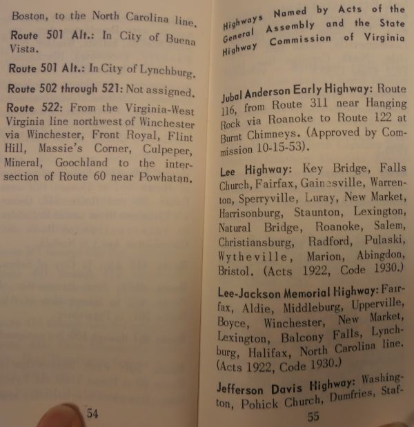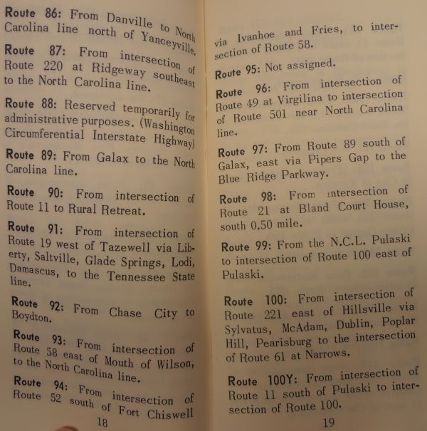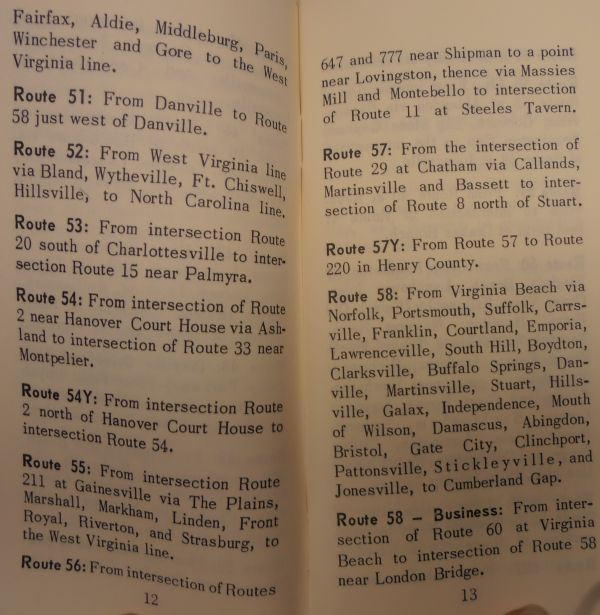 < 1951 Route Log | Home | 1979 Route Log > Road Data: June 1957, Virginia Department of Highways Distance Data: No distances given Notes: This is the official 1957 route log of Virginia, scanned in its entirety. The logbook contained an index, followed by a listing of all routes' descriptions, followed by a list of 39 legislatively named routes in place at that time, followed by a list of 58 legislatively named bridges in place at that time, followed by a list and description of the US routes in Virginia (including banner routes). Click on the thumbnails below to see the scanned pages of the logbook. |