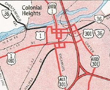 In Aug 1951 (CTB), US 1 was rerouted through Petersburg: NB followed Washington to N. Adams (had been US 1 ALT) to Henry St to 3rd St to Bollingbrook west to the Appomattox Bridge location; SB used Bollingbrooke west to N. Sycamore St north to Grove Ave west to Market south to Washington. In Nov 1953 (CTB), US 1 was placed on one-way splits in Richmond: NB used Broad St, Bowe St, Moore St, Lombardy St; SB used Lombardy St and Broad St. I have yet to find a Richmond map that shows the US 1 and US 60 routings used throughout most of the 1950s. In Oct 1954 (CTB), US 1 was placed on its current routing through Crystal City. At some point after 1958, US 1 was operationally placed on one-way splits in Downtown Fredericksburg with NB using Caroline St/Herndon St and SB using Princess Anne St. In Sept 1959 (CTB), US 1 was given its current routing through Richmond with the completion of Chamberlayne connecting to Belvidere directly.