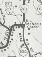 | Adjustments: In Aug 1933 (CTB), VA 201 was extended west towards Monaskon. In Sept 1937 (CTB), VA 201 was extended to Monaskon. In May 1943 (CTB), VA 201 was truncated back to its current end, leaving behind SR 681 and a small bit of VA 354. Sometime after 1961, VA 201 was given its current routing through McNeal's Corner. Before, VA 201 used today's VA 201Y and SR 600 to inexplicably use two legs of the triangle. The SW leg of the triangle is now VA 201Y and the SE leg is SR 600.