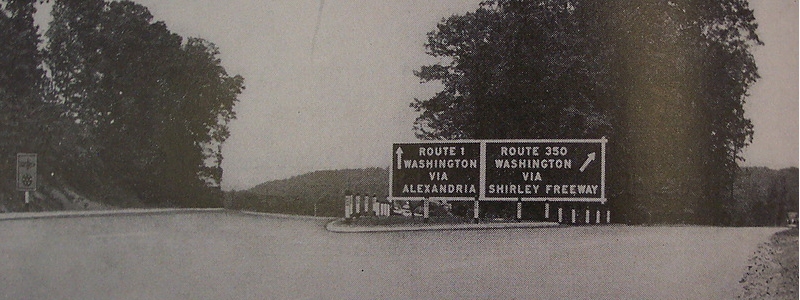 Per Scott Kozel's detailed history of the Shirley Highway, separately from anything Virginia was doing, the construction of the Pentagon in 1941 brought about the need for an improved road network near the Potomac River around Washington DC. Thus, the US Public Roads Administration was in charge of building the network of roadways. This included the Fort Belvoir Bypass from VA 7 to US 1, as well as US 1 to the 14th St bridge. In March 1942 (CTB) the 17-mile multilane Ft. Belvoir Bypass is confirmed that it will be constructed and named for the recently deceased Highway Commissioner, Henry G. Shirley. In Oct 1943 (Kozel), Shirley Highway was opened as a 2-lane route from VA 7 to the 14th St Bridge. In Aug 1944 (CTB), the Shirley Highway was designated as limited access. The earliest explicit reference I can find calling the highway VA 350 is in the Oct 1944 CTB in a discussion about whether to allow filling stations along the route. It also appears on the 1945 Arlington County Map south of VA 7. In Oct 1944 (Kozel), VA 350 was widened to a 4-lane expressway from VA 7 to the 14th St Bridge. In March 1946 (CTB), the southern end of VA 350 is specifically defined to be the north end of the US 1 Occoquan Creek (sic) bridge. Since VDOH did not build or maintain the portion of Shirley Hwy north of VA 7, it is reasonable to wonder if that portion was part of VA 350. The answer is yes - the 1949 and 1957 Route Logs both define the north end of VA 350 to be "on US Route 1, 0.56 miles south of the south end of the 14th St Bridge..." The 1946 Official is the first to label VA 350 anywhere and does do so between VA 120 and VA 244. VA 350 may have opened to VA 236 Lincolnia in 1948 before opening all the way to US 1 at the Occoquan Bridge in Sept 1949 (Kozel). Per Kozel, trucks were banned south of SR 644 Springfield, which was initially a 2-lane road.