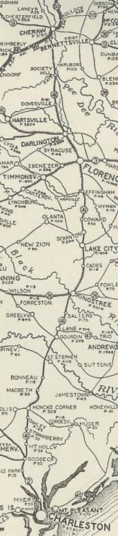 SC 41 #1: An original state highway running from SC 2 (now US 78) near Goose Creek north through Moncks Corner, Kingstree, Lake City, Florence, and Darlington before ending at SC 50 (now S-13-148) near Cheraw.