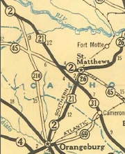 SC 210 #1: Appeared in July 1936 (SCDOT) as new primary routing, running from US 178 Orangeburg north to US 21/SC 2 (now US 176) Sandy Run.
