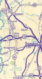 Improvements: SC 261 was paved from the US 52/SC 375 jct northwest to US 521 in 1932. SC 261 was paved from Paxville to Manning in 1937. SC 261 was paved from Lane northward in 1938. SC 261 was paved from Paxville to the Sumter line in 1939. SC 261 was paved from Lane southwest to US 52 in 1940. SC 261 was paved from Pinewood east to the Clarendon line in 1941. By 1948, SC 261 was paved from Poinsett S.P. north to US 76. In 1949, SC 261 was paved from Poinsett S.P. to Pinewood. All extensions of SC 261 were paved upon designation after this. SC 261 only has 2 multilane segments: US 52 duplex which was multilaned east of the Black River by 1975 and west of the Black River in 2000. I-95 to Manning which is not shown on maps but has been that way back to at least the mid 1990s. Comment: SC 261 is one of the longer 3-digit routes in South Carolina. SC 261 serves Poinsett State Park. | ||||||||||||||||||||||||