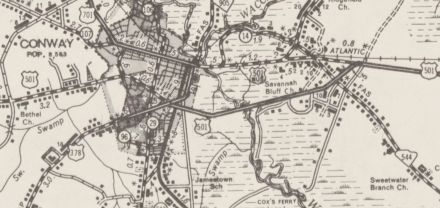 Adjustments: In April 1937 (SCDOT), US 501 was removed from today's S-26-14 just east of Conway, leaving behind SC 90 ALT. In 1949, US 501 was given a direct route from Myrtle Beach to Conway, replacing SC 503. The old routing via Socastee became part of SC 544 and all of SC 707. Today this is: S-26-272 Washington Ave; SC 544; Dick Pond Rd; SC 707; Emory Rd/Powell Lane; abandoned routing through the airport; S-26-15 Old Socastee Hwy.