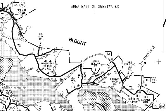 | Adjustments: In 1927 or 1928, TN 72 was rerouted to end at TN 33 (now Old Niles Ferry Pike) southwest of Maryville. The original route used Happy Valley Rd and Montvale Rd to Maryville. In 1930, TN 72 was extended north on Old Niles Ferry Pike to the new TN 33 (current US 411) in Maryville. In 1934, TN 72 was rerouted near Tallassee to instead replace TN 95 northwest to Loudon, then extended west as new routing to end at TN 58 (now Walnut Grove Rd) near today's TN 58-304 jct. 4 miles below Kingston. The old route to Maryville became TN 115 (which connected to US 411 where it does now) and Old Niles Ferry Pike was removed from the state highway system.