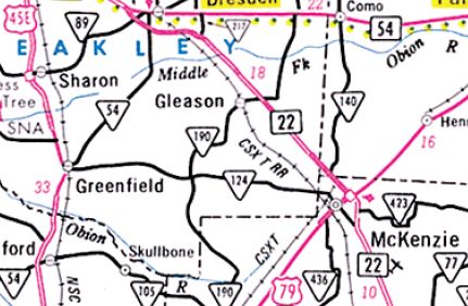 Adjustments: In 1958, TN 124 was extended over TN 22 from its old entry into McKenzie at Elm St to US 79. Between 1990-93, Tn 124 was extended over more TN 22 out to the modern TN 22 southeast of downtown. Posting: Posted as secondary routing throughout Secret US Route Overlay: None Comment: TN 124 is a simple connector from Greenfield to McKenzie.