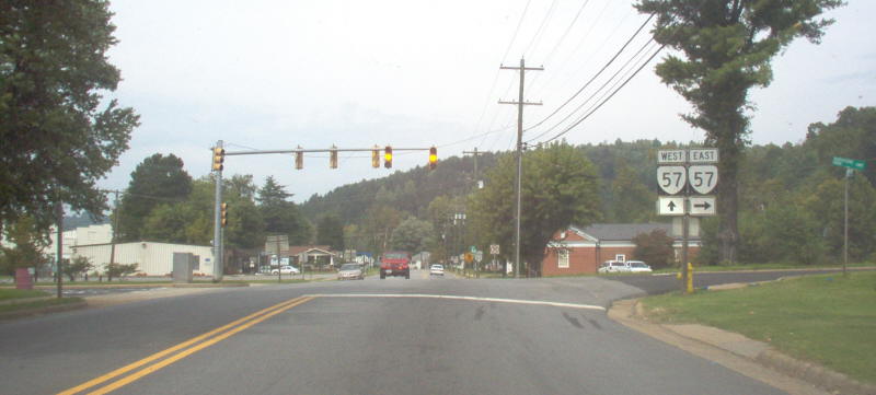 | From VA 57 eastbound. VA 57 mainline runs by a bunch of mills on the north side of the Smith River while VA 57A is quicker to Martinsville. Photo by Mapmikey, taken September 23, 2006. | |