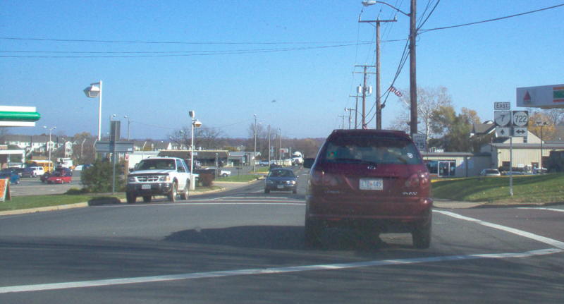 | From 1945-80, VA 287 south ended in Purcellville proper. Here is the view from VA 7 Bus eastbound. VA 287 followed SR 722 to the left here. Photo by Mapmikey, taken November 9, 2006. | |