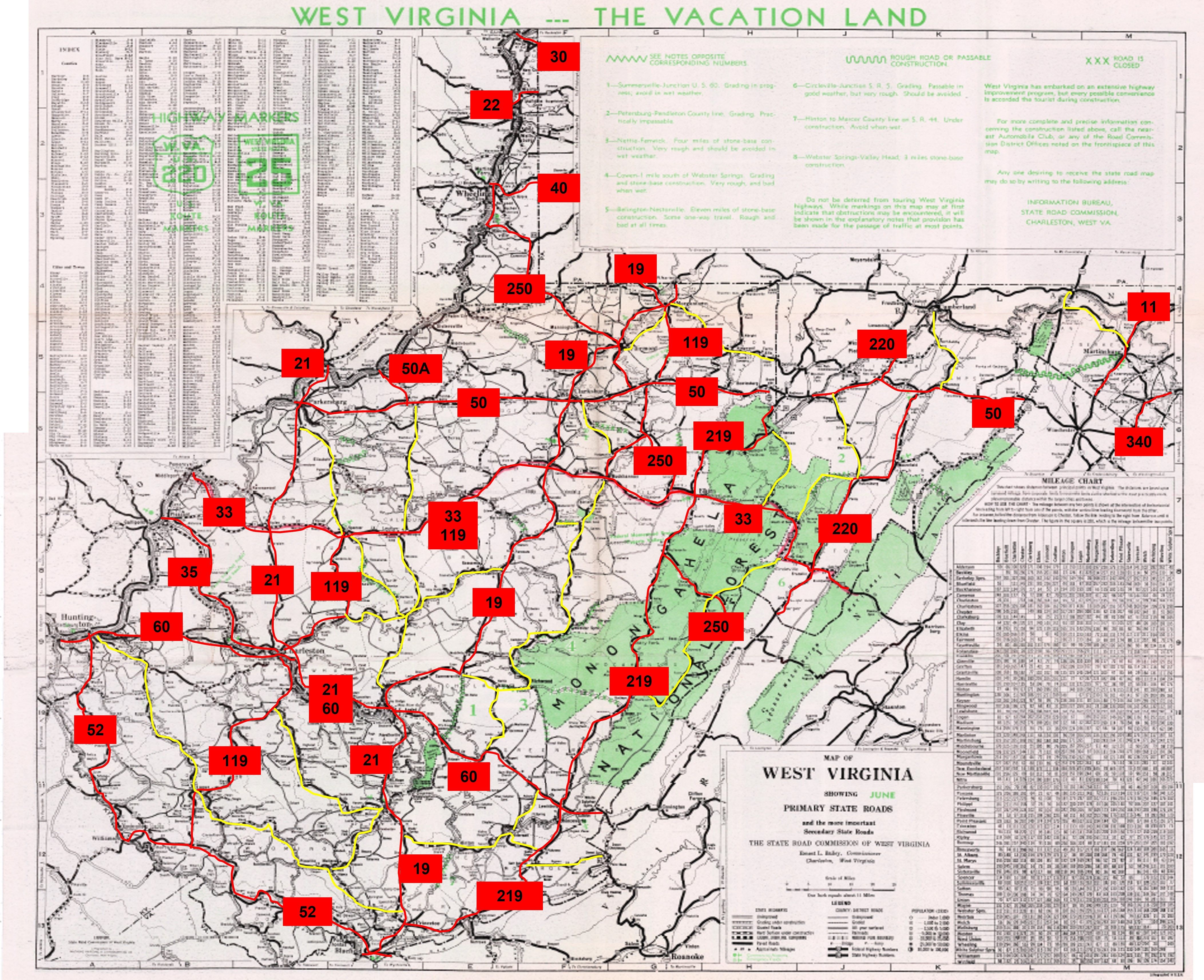 Say what??? There is a document in the 1938 Other folder at the AASHTO database titled "State Road Commission of West Virginia Tabullation Showing Proposed Routes for Designation as Interstate Routes." The first page is a list of West Virginia routes and two endpoints. Following that are a page dedicated to each of those lines giving a very detailed description of pavement types and widths and the lengths of each category, plus how much overlap there would be with an existing US route.